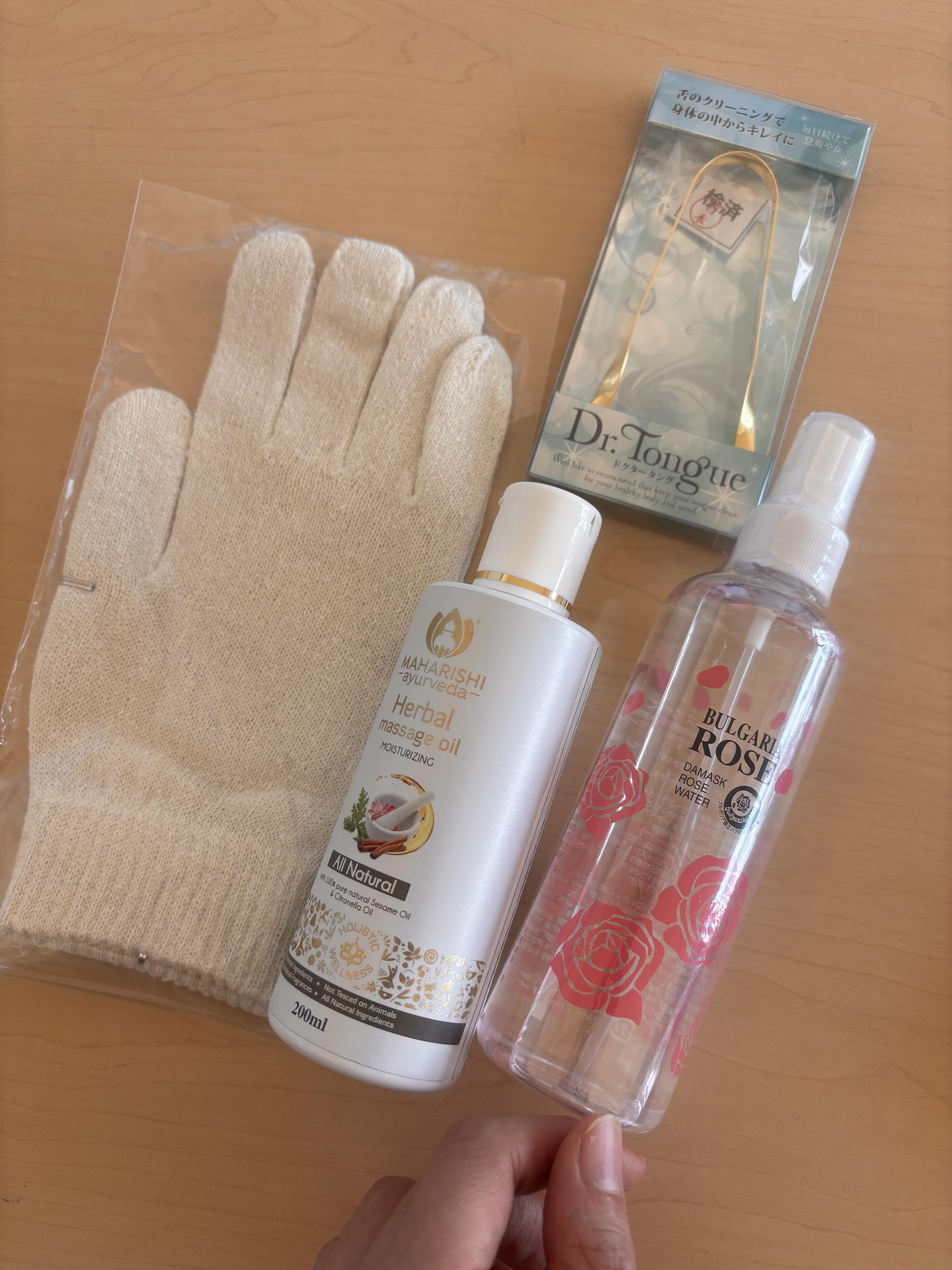 (セルフケア用オイル、タングスレーパー、ローズウォーター)